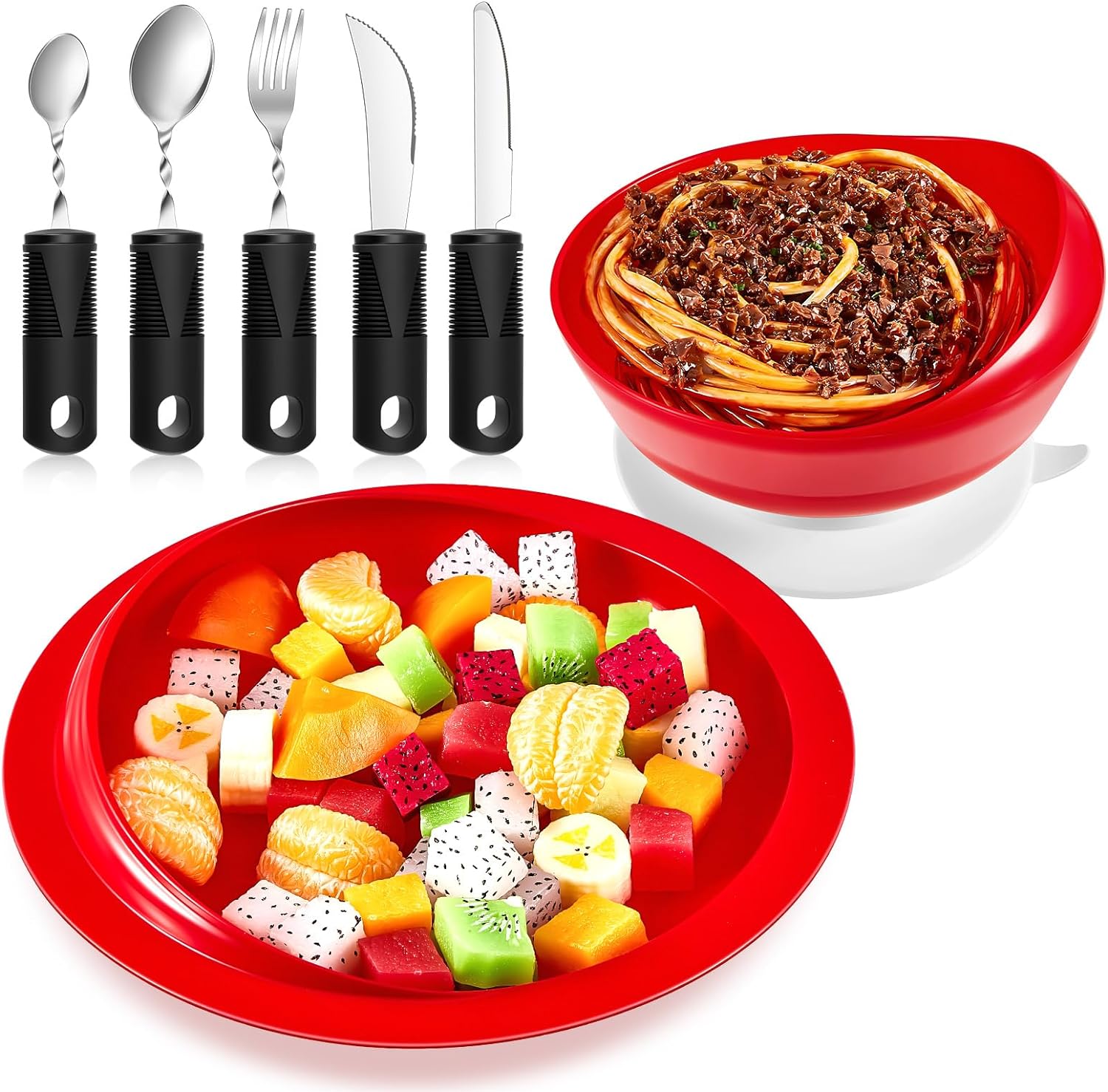 8 reviews for 2 Sets Adaptive Utensils Bowl and Plate Set Adaptive Self Feeding Dinnerware with Suction Base Non Slip Bendable Cutlery for Elderly Disabled Hand Tremors Arthritis Parkinson(Red)