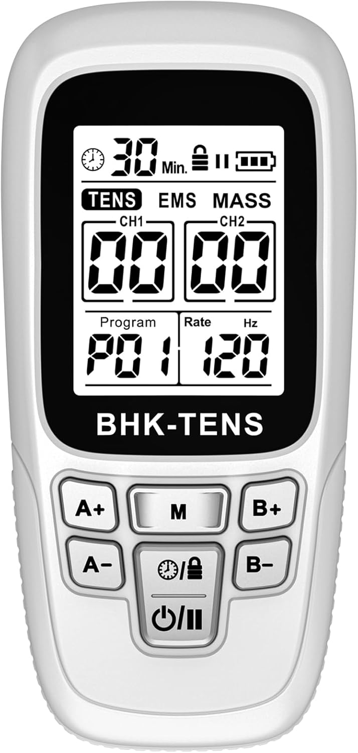 I got this to see if it can replace my older unit I use as this new BHK-TENS one has various features that sound better:Pros:- Rechargeable via USB-C port (No need to purchase and waste batteries!)- Can control 4 pads (2 ports with 2 outputs)- 3 Main modes:1. TENS (Transcutaneous Electrical Nerve Stimulation): Primary use -> Pain relief2. EMS (Electrical Muscle Stimulation) – Primary use: Muscle Strengthening3. MASS – Primary Use: Deeper muscle activation or “body shaping”- 8 options in each mode- Pause function- Lock button- Backlit display- Increase/Decrease strength for each outputCons:- Instruction booklet doesn’t describe main modes or what each submode does and doesn’t explain what the “pad-sticking board” is supposed to be used for- Could use a clip on the back so you can more easily carry it around without having to shove it into your pocket, but it does have a “lock mode” so it doesn’t change settings while in your pocketOverview:It works well and I like some of the features, but the output modes are a bit confusing as to what the differences are and do and it’s not described at all in the manual, so it’s all trial and error. It doesn’t seem to have pulse modes or changing modes like my older unit has and I miss that. I do like the backlit display and the fact that it is rechargeable, and it seems relatively inexpensive and so a good intro to using these types of devices for newcomers.