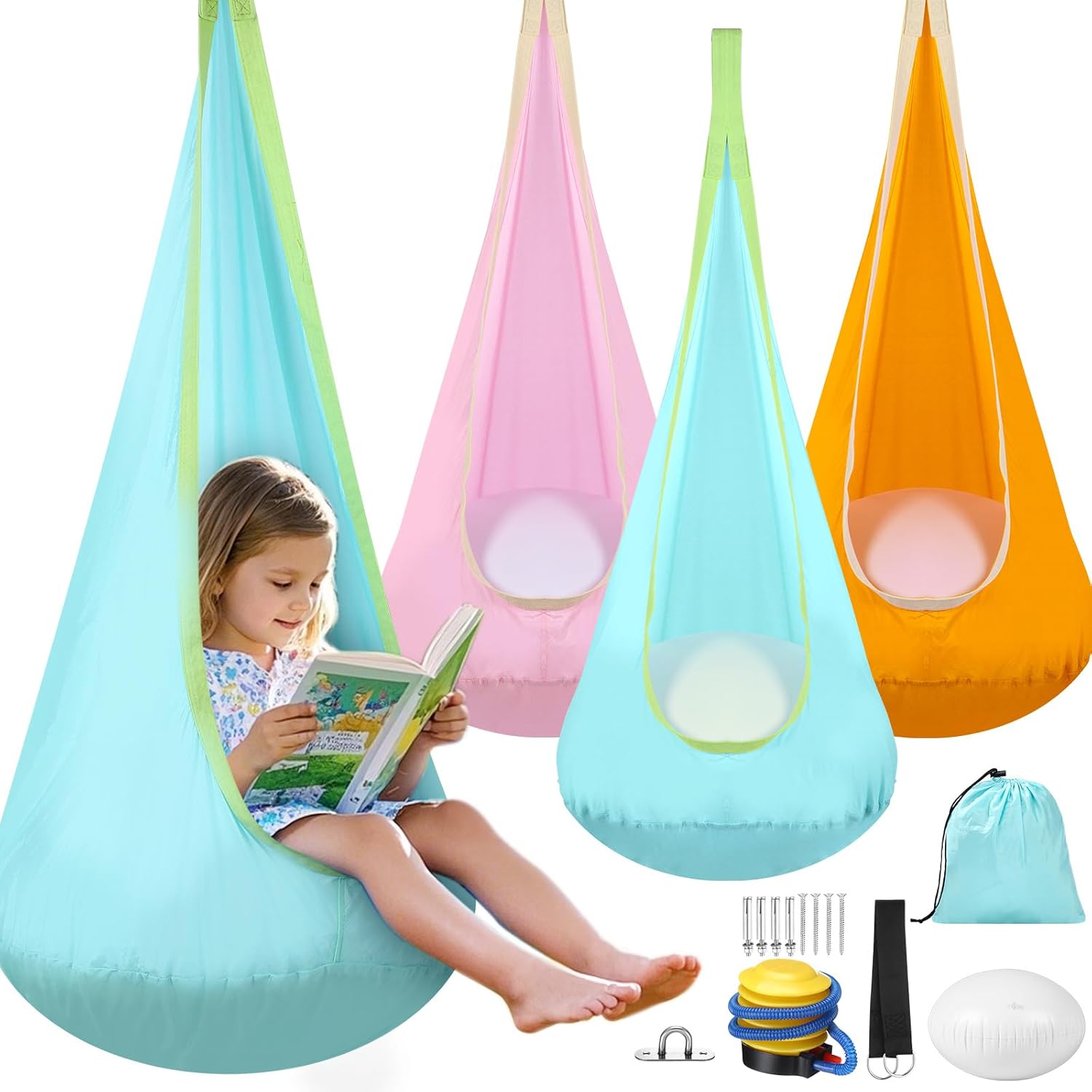 2 reviews for 3 Set Kids Pod Swing Seat, Max 220 Lbs, Child Sensory Swing Indoor Outdoor Hanging Hammock Chair with Inflatable Pillow Pocket for Kids Indoor Outdoor Use, Blue, Pink, Orange