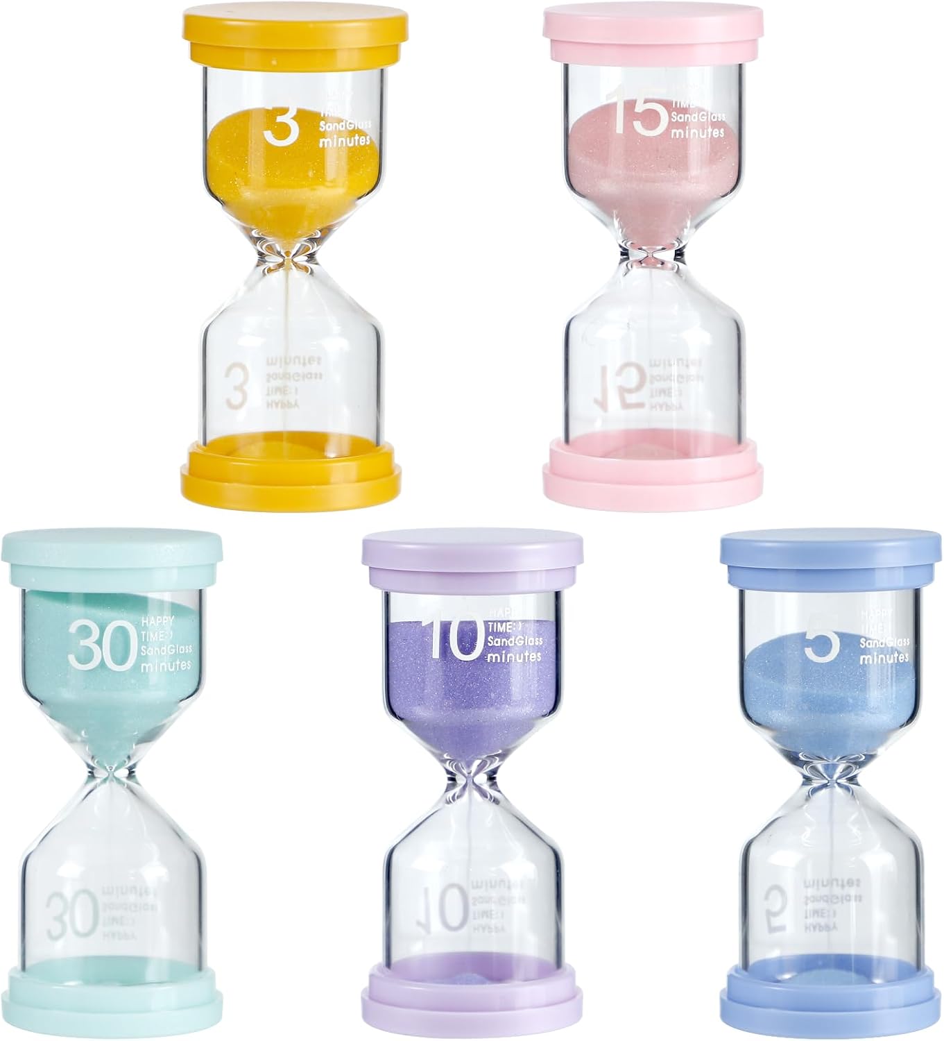 1 review for 5Pcs Sand Timers for Classroom & Kids, Colorful Hourglass Set, 3/5/10/15/30 Mins Visual Timer for Children Brushing Teeth, Classroom Games, Homework, Office, Cooking