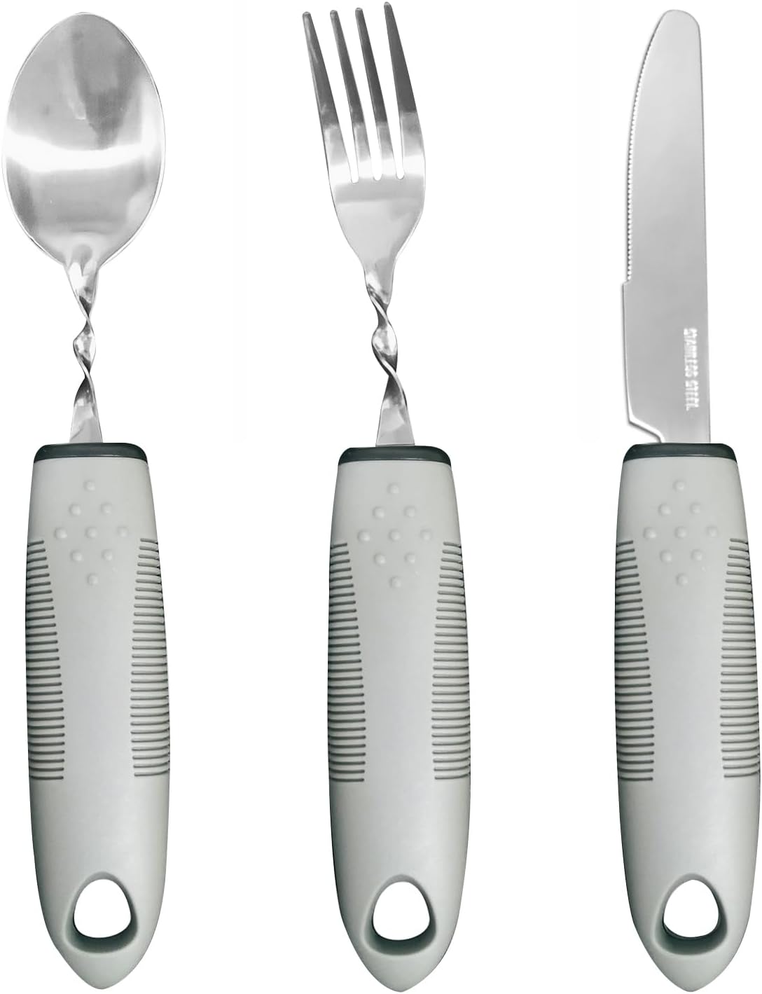 Adaptive Utensils (3Piece Kitchen Set), Right Handed Curved Spoon and Fork, Non-Slip Handles for Hand Tremors, Arthritis, Parkinson’s Elderly use – Stainless Steel Knife, Fork, Spoons