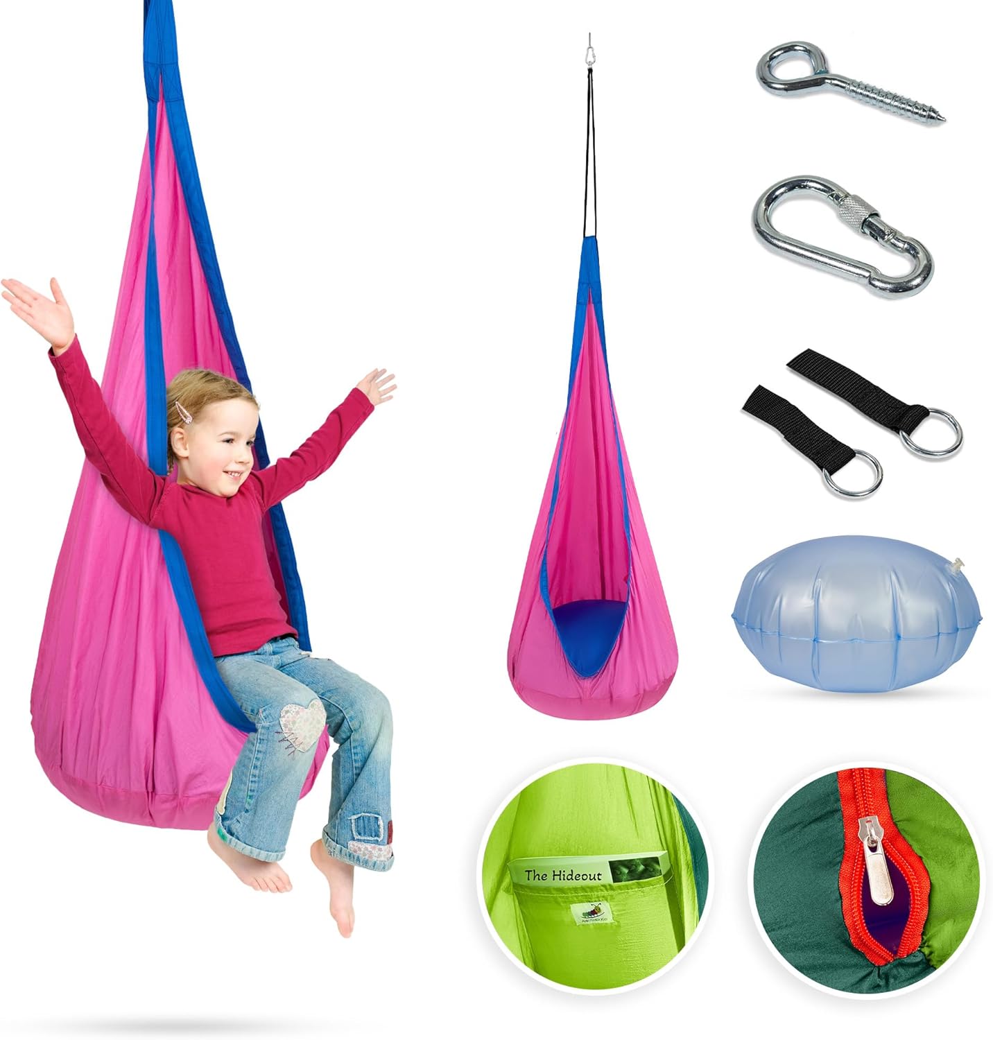 Child Hanging Pod Swing Chair with Pocket, Hanging Hammock Cocoon, Indoor and Outdoor Fun, Relaxation Nook, Sensory Autism Therapy, Easy to Hang Comfortable Nest, Girls and Boys (Pink)