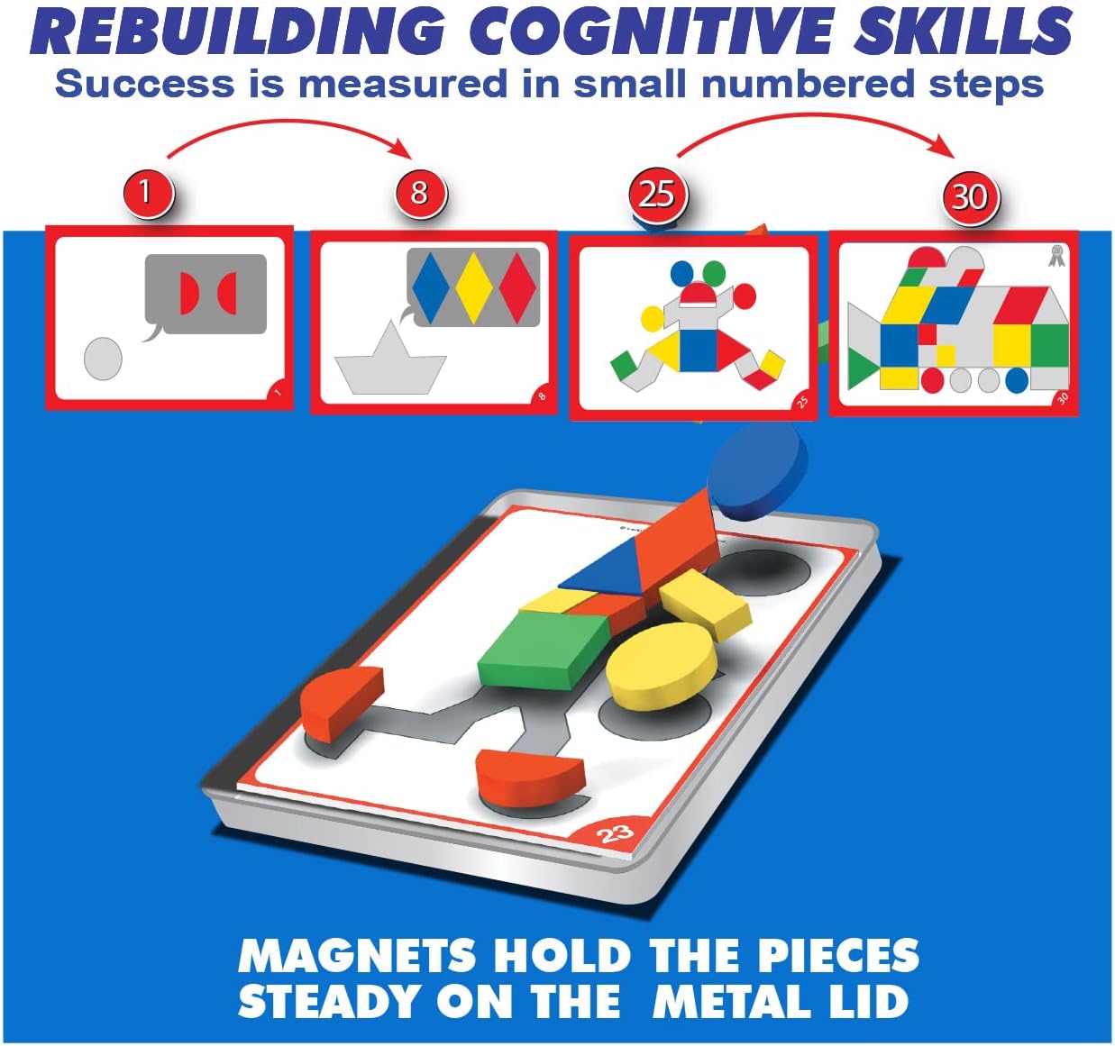 We received 2 sets of puzzle pieces and only one set of magnets. You have to attach the magnets to the puzzle pieces. They do not come assembled. Once we got it all put together, I gave it to my grandmother. I wasn’t expecting much. Most things she picks up, puts down and is disinterested very quickly. Not true with this puzzle box. She sat and played for about an hour on multiple cards. I was very pleased to see her engaged and happy. I recommend this product for people with memory loss. It has worked well for ushopefully, it will work well for you too.