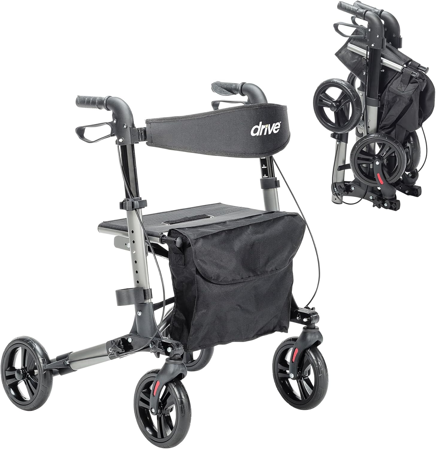 Drive Medical Compact Folding Rollator – Lightweight Foldable Walker for Seniors, 4-Wheeled Walker with Seat & Brakes, Space-Saving & Portable Travel Rollator with 8-Inch Wheels – Just 15.4 Pounds