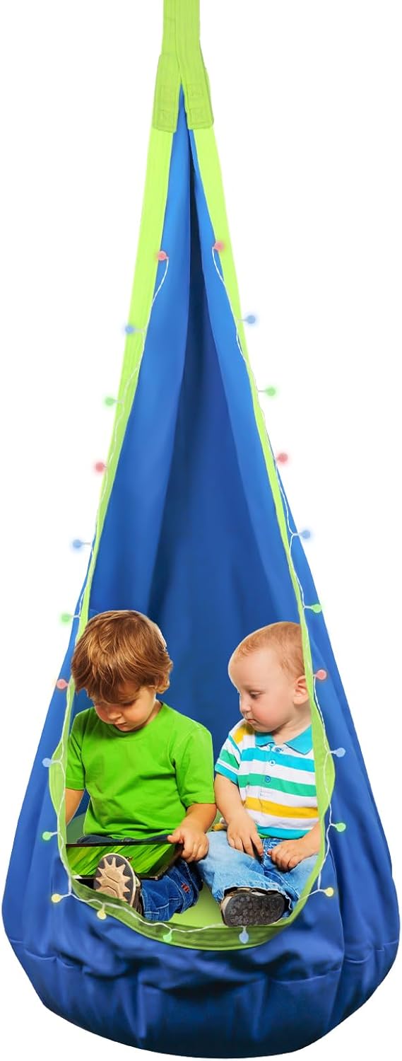 Light Up Kids Pod Swing Seat – Child Hanging Hammock Swing Chair Cotton with LED Lights, Sensory Pod Swing Chair with Inflatable Pillow & All Accessories for Indoor and Outdoor Use Calming Swing(Blue)