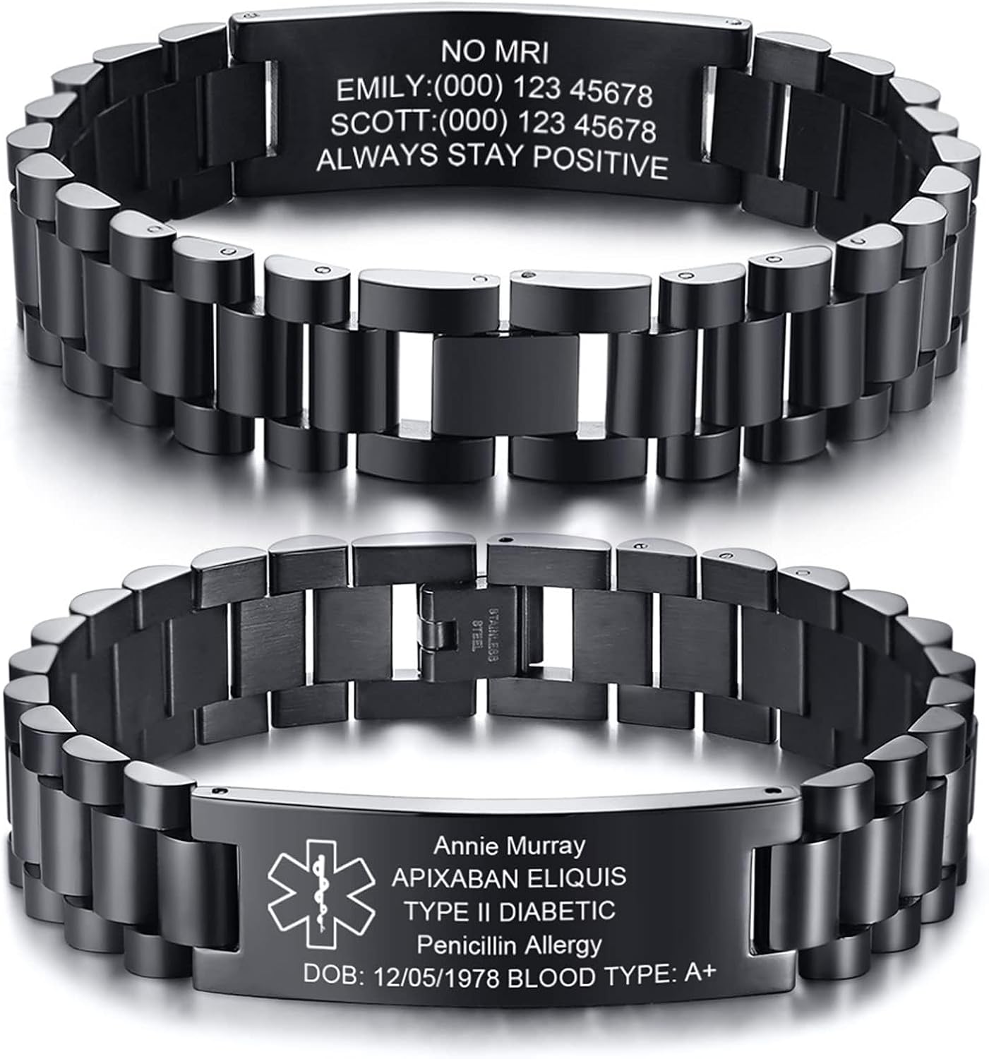 13 reviews for Medical ID Bracelet for Men: Free Engraving Black Masculine Watch Band Style Medical Alert Wristband Personalized Medic ID Bracelet Jewelry for Men