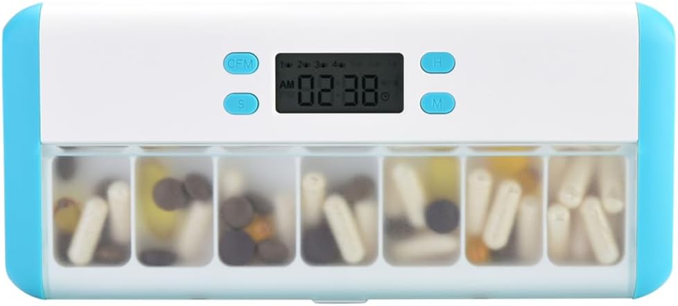 Smart Pill Organizer, Pill Box Alarm Clock, beep, Vibration, LED Light Flashing Remind to take Medicine, Automatic Reminder Every Morning/Afternoon, 7 Alarm Clock, 7 Day Pill Organizer