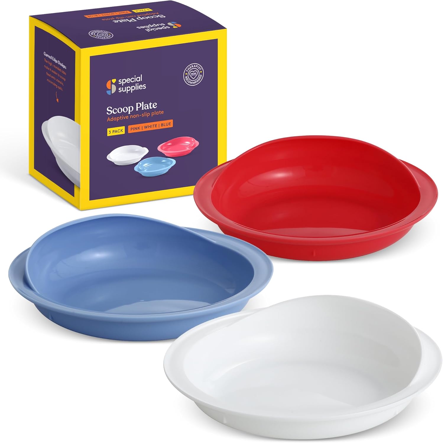 Special Supplies Adaptive Spill-Proof Scoop Plates- Dishes with Wall for Disabled, Elderly Adults with Special Needs from Parkinson’s, Dementia, Tremors- 3 Pack (White, Blue, Red)