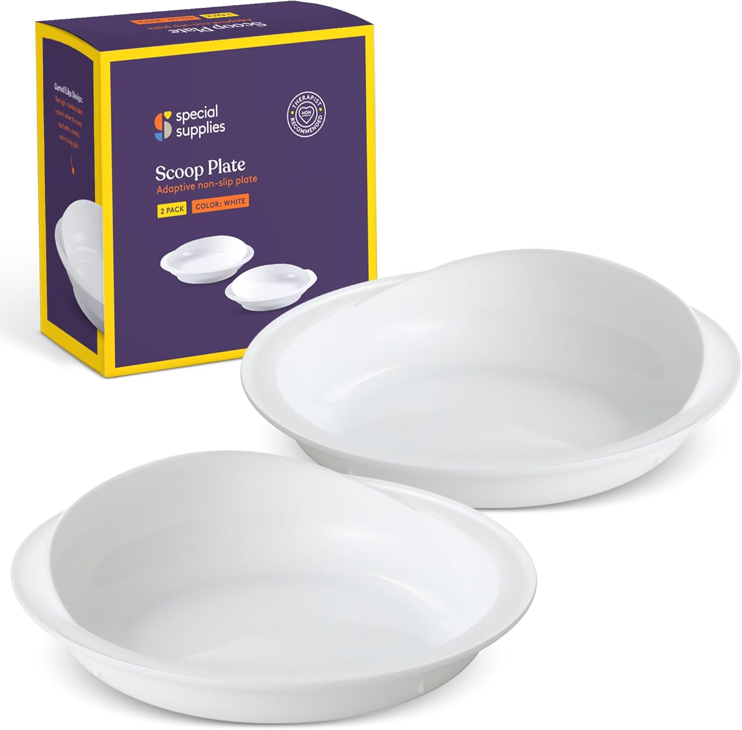 Special Supplies Adaptive Spill-Proof Scoop Plates- Dishes with Wall for Disabled, Handicapped, Elderly Adults with Special Needs from Parkinson’s, Arthritis, Dementia, Stroke, Tremors- 2 Pack (White)