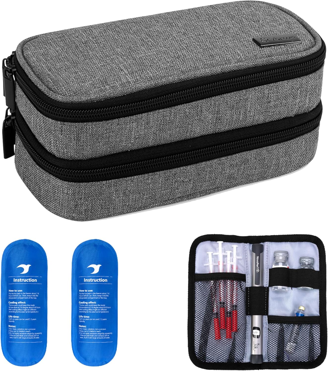 Yarwo Insulin Cooler Travel Case, Double-Layer Diabetic Travel Case with 2 Ice Packs, Diabetic Supplies Organizer for Insulin Pens, Blood Glucose Monitors or Other Diabetes Care Accessories, Gray